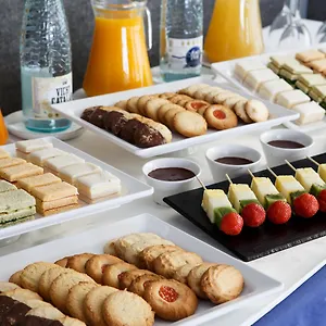 Expo Hotel Barcelona, a 4 stelle, offre opzioni gastronomiche per tutti i gusti. Il ristorante Stop 'N' Bite offre una colazione a buffet variata e ricca, in un ambiente tranquillo e moderno. Non mancheranno prodotti freschi e artigianali come uova strapazzate, pane fatto in casa e deliziosi dolci, patate hash brown e salumi locali. Non da meno, la Terraza BCN Urban Club, nascosta sul tetto dell'hotel, offre una vista mozzafiato su Montjuic e gustosi hamburger gourmet.